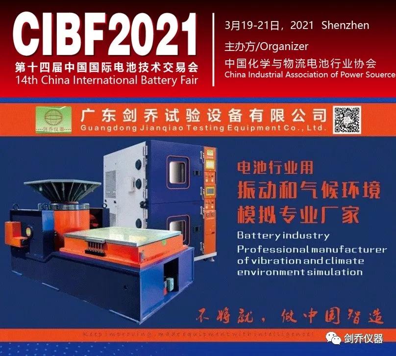 2021年3月19-21日,廣東劍喬試驗(yàn)設(shè)備有限公司【劍喬儀器】將攜旗下最新試驗(yàn)設(shè)備亮相2021年的第一場(chǎng)展會(huì)—(CIBF2021)“第十四屆中國(guó)國(guó)際電池技術(shù)交流會(huì)/展覽會(huì)”。現(xiàn)場(chǎng)展示:振動(dòng)試驗(yàn)系統(tǒng)、溫濕度振動(dòng)三綜合箱、電池?zé)釣E用試驗(yàn)箱、電池短路試驗(yàn)箱、高加速?zèng)_擊試驗(yàn)臺(tái)、高低溫防爆試驗(yàn)箱、等試驗(yàn)設(shè)備及動(dòng)力電池相關(guān)試驗(yàn)解決方案。