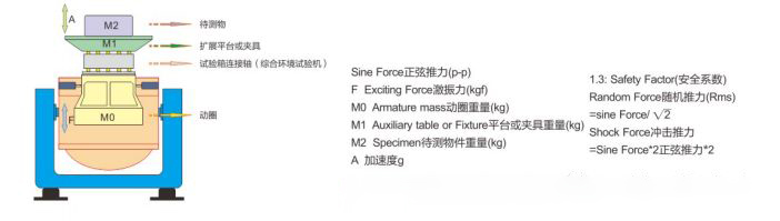 這里,m1是試件的質量;m2 是夾具的質量;m3 是振動臺可動系統(即動圈)的質量;m4 是垂直擴展臺面的質量(當振動臺工作于水平振動時,m4 為水平滑臺可動系統重量)。