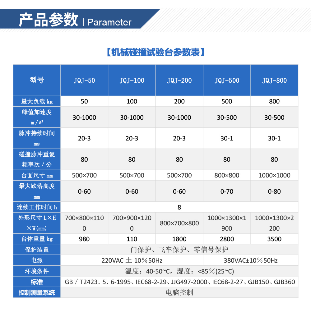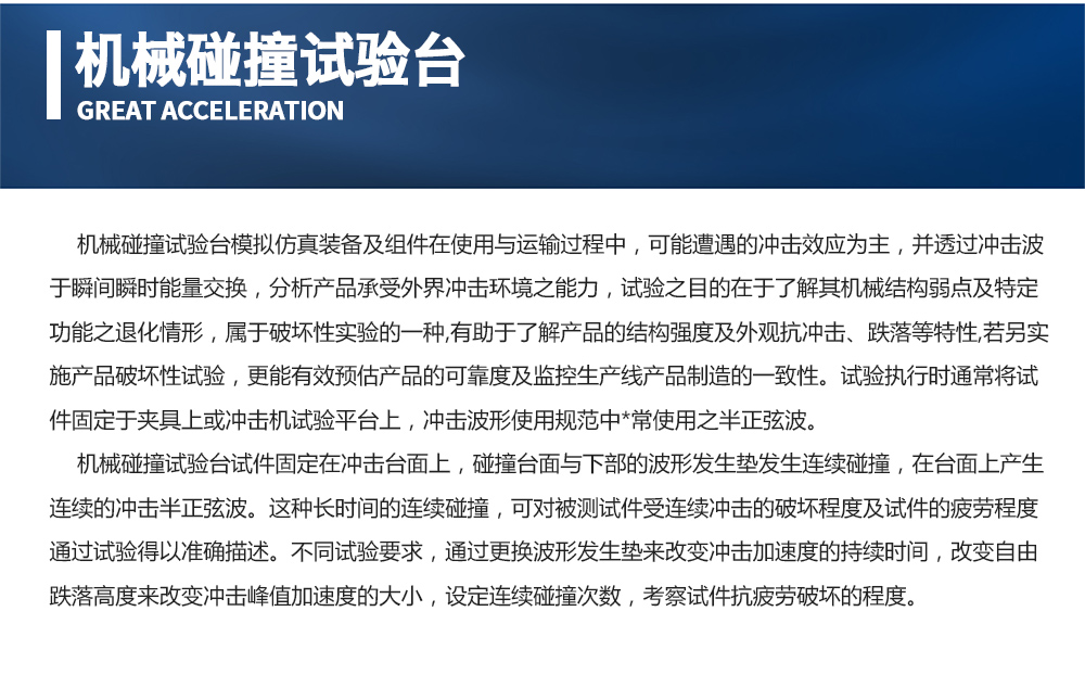 產品型號:JQJ-100 品牌:劍 喬 用途:機械碰撞試驗臺模擬仿真裝備及組件在使用與運輸過程中,可能遭遇的沖擊效應為主,并透過沖擊波于瞬間瞬時能量交換,分析產品承受外界沖擊環境之能力,試驗之目的在于了解其機咨詢熱線:13829135130